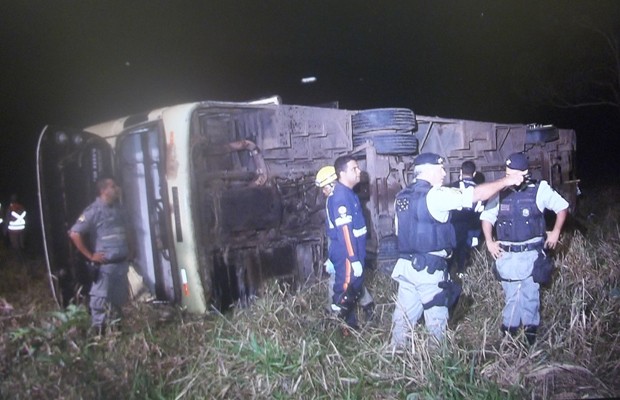 Policiais prestam atendimento no local onde ônibus capotou em Luziânia (Foto: Reprodução / TV Globo)