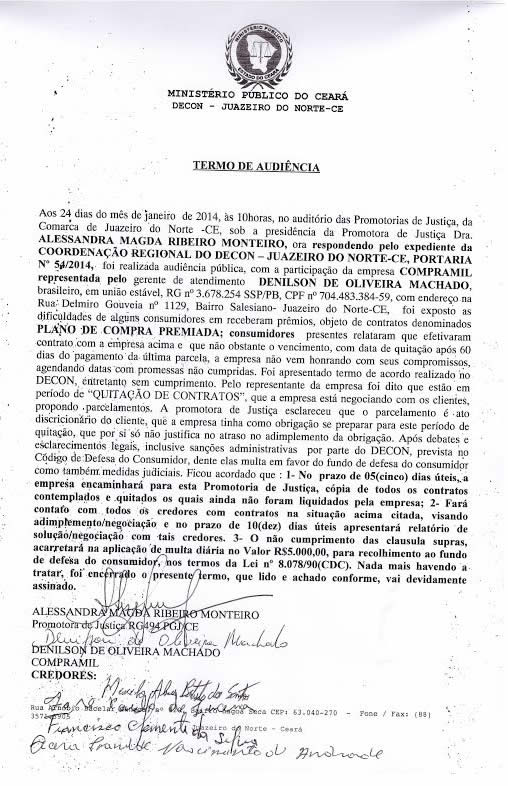 No dia de ontem, a empresa se recusou a receber a intimação da coordenadora do Decon e foi necessário a presença da policia para que a intimação fosse recebida pela empresa. Segundo a promotora Alessadra Magda, caso a Compramil Cariri não venha a cumprir corretamente os termos contratuais com seus clientes poderá sofrer multas pesadas e até ter que fechar as portas. "Estamos fazendo o possível para que a empresa denunciada consiga resolver amigavelmente todas suas pendências com seus clientes", afirmou a promotora. Por sua vez o gerente da Compramil foi notificado que tem cinco dias uteis para informar ao Decon todos os contratos da empresa e dez dias para apresentar um relatório de negociação.Abaixo o Termo de Audiência entre a Compra Mil Cariri e o Decon de Juazeiro do Norte.