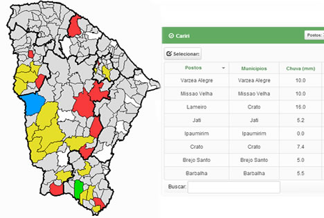 No Cariri ainda choveu nas cidades de Missão Velha (10 mm), Várzea Alegre (10 mm), Barbalha (5.5 mm), Jati (5.2 mm) e Brejo Santo (5.0 mm). A cidade de Crateús, com 30 mm, registrou a maior precipitação do Estado do Ceará este dia.