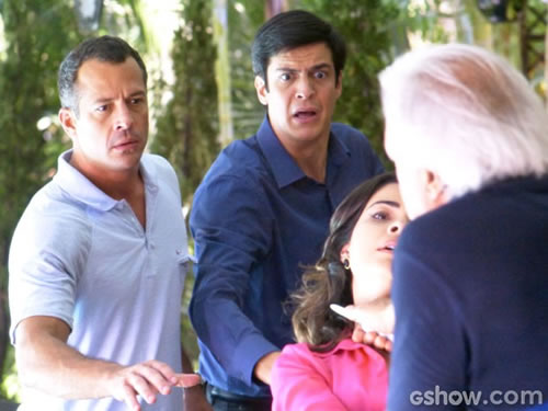 Quando seu segredo é revelado, Aline fica em choque e mente . "César, é mentira. É mentira". "É mais uma mentira do Félix, não é meu amor?", pergunta o médico. "Claro, César, é mais uma mentira", confirma a vilã.