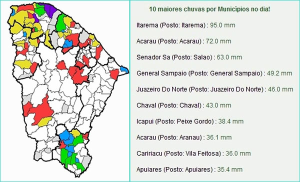 no Litoral Oeste do Estado, com 95 milímetros em Itarema, seguido por