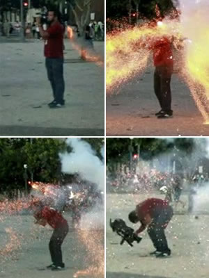 O cinegrafista está em pé, com a câmera no ombro, trabalhando no meio da praça. No primeiro registro, vê-se um rastro de fogo com faíscas perto das costas dele.