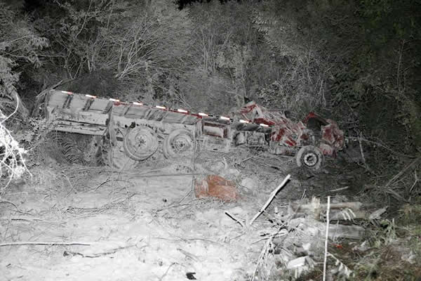 O caminhão Mercedes Benz carregado de gesso caiu em uma ribanceira com