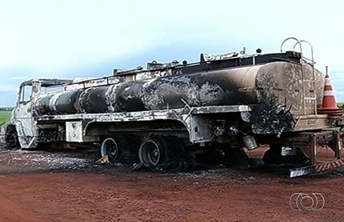 Caminhão fica destruído e pneus derreteram por causa do fogo (Foto: Reprodução/TV Anhanguera)