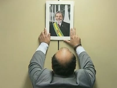 Líder do PR na Câmara, Bernardo Santana, pendura na parede retrato oficial do ex-presidente Lula. (Foto: Reprodução / GloboNews)