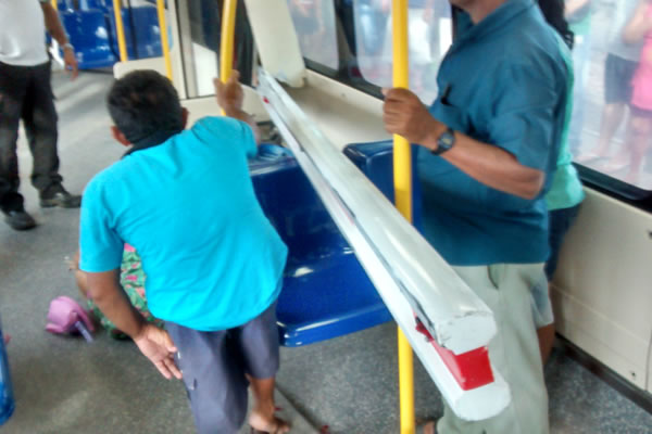 A enorme barra de metal que interrompe o fluxo de veículos na via foi parar dentro do vagão. (Foto: Agência Miséria)