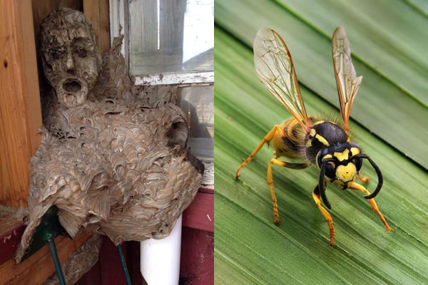 Um enorme ninho de vespas se fundiu com uma escultura em madeira de um rosto humano assustado. Vespas podem crescer até 2 centímetros e sua picada é bastante dolorida. (Foto: The Mirror / Reprodução e Wikipédia)