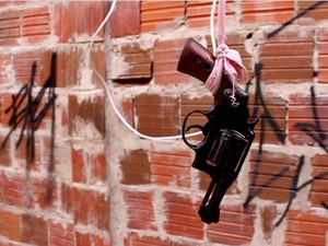 Arma de fogo foi encontrada pendurada em varal após receber pintura (Foto: TV Verdes Mares/Reprodução)