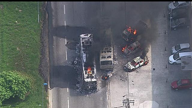Pelo menos quatro ônibus, um caminhão e dois carros foram incendiados.