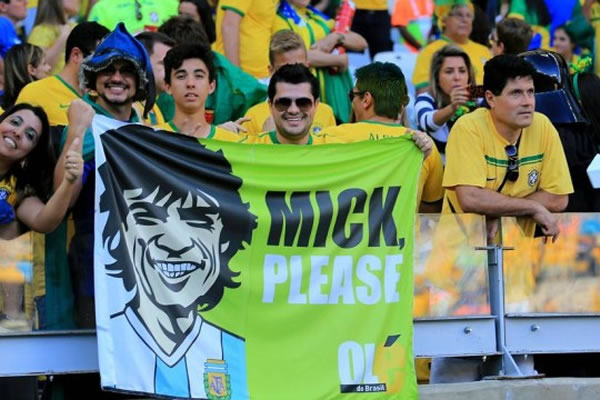 Passado o susto e o sofrimento da difícil partida do Brasil contra o Chile, pelas oitavas de final da Copa do Mundo, foi possível relaxar e já entrar na provocação contra os velhos rivais argentinos. No jogo de ontem, um torcedor brasileiro levou um cartaz ao Mineirão com uma caricatura do cantor inglês Mick Jagger com uma camisa da Argentina.