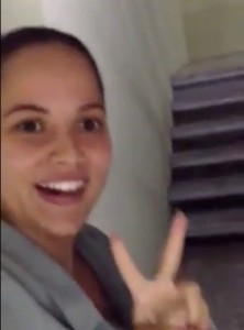 ela dá uma risadinha e faz sinal com um “v” com os dedos (foto).