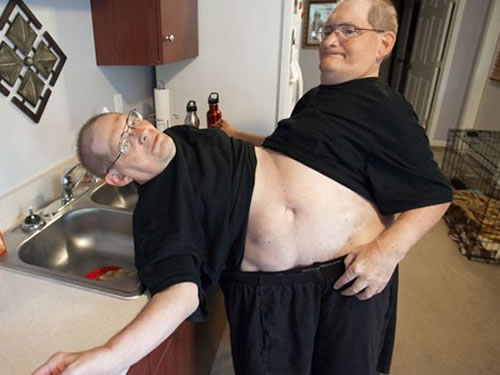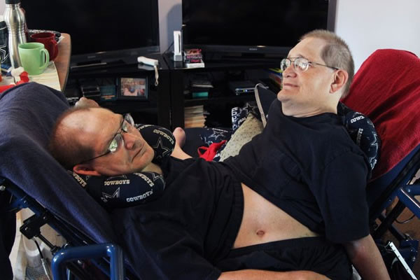 Os irmãos, que são ligados pelo abdomen, vivem com Jim e sua esposa na cidade de Beavercreek. O casal começou a cuidar dos gêmeos há quatro anos, quando eles estavam com a saúde debilitada e a comunidade ajudou com US$ 170 mil para a reforma da casa. "Chegamos ao ponto em que eles não conseguiam fazer mais nada sozinhos", disse Jim Galyon.