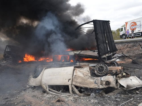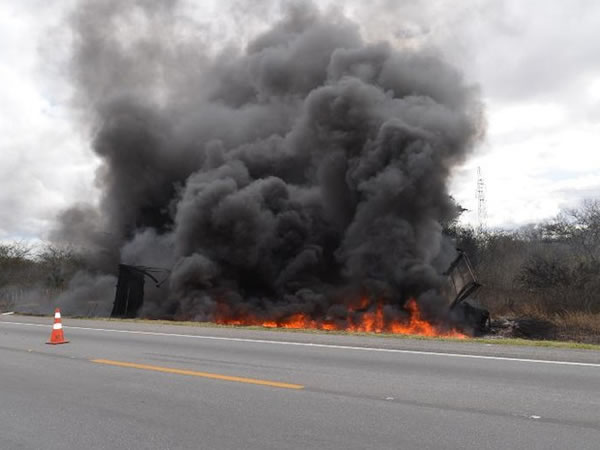 Com a batida, alguns veículos incendiaram e o Corpo de Bombeiros precisou ser chamado para conter as chamas. Por conta do incêndio, a PRF informa que podem ter mais pessoas mortas, mas a confirmação só poderá ser feita apenas após o laudo do Departamento de Polícia Técnica (DPT), que já está no local.
