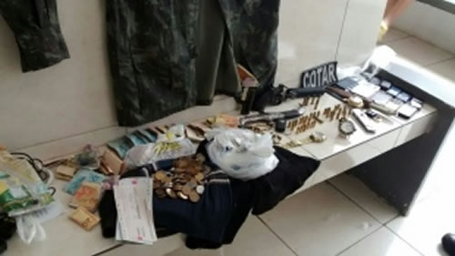Na casa de Tiago foram encontradas 5 pedras de crack e um pó branco ainda não identificado pela Polícia. Já na casa dos pais dele, um revóvel calibre 38, munições para armas de calibre 38 e 380, silenciador para pistola e fuzil, 10 celulares, um carro Punto da cor preta com fundo falso para armazenamento de drogras, relógios, facas, um uniforme do exército e R$ 8 mil foram apreendidos.