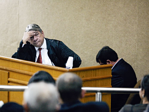A defesa foi representada pelo advogado Clayton Marinho. O réu Vítor Quinderé Amora passou quase todo o julgamento de cabeça baixa. (Foto: Natinho Rodrigues)
