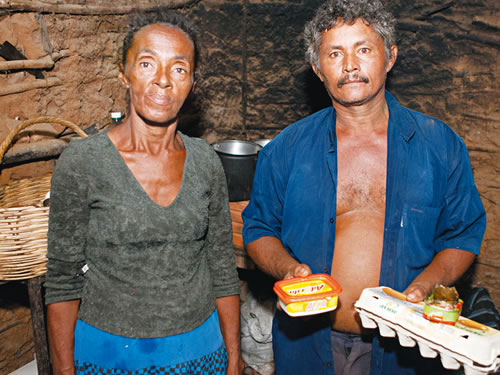 "Quem tem fome não tem escolha. Não tenho vergonha de dizer que pego muita coisa do que a gente come no almoço do lixo. Mas são mercadorias que ainda estão boas. Graças a Deus, nunca ninguém aqui adoeceu por causa disso", relata dona Dita, que mora com o esposo e o resto da família numa pequena casa de taipa e de chão batido, de apenas três cômodos.