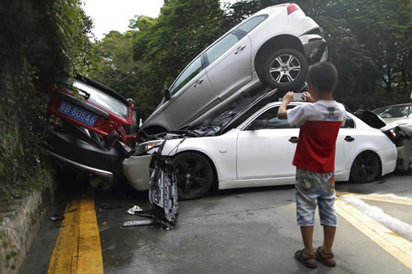 Carros ficam empilhados após acidente na China