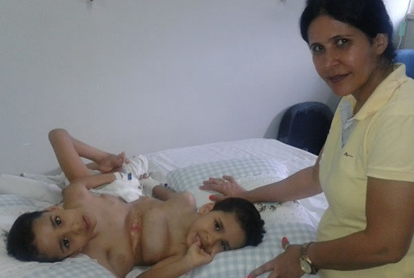 Os gêmeos siameses Arthur e Heitor, de 5 anos, unidos pelo tórax,