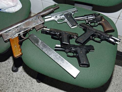 Dentro do veículo foram encontrados uma submetralhadora calibre nove milímetros, quatro pistolas, sendo uma 0.40 e três 380 e um revolver 38.