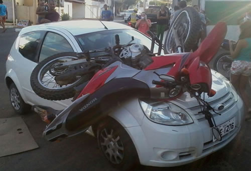 Já por volta das 16h30min de ontem um carro bateu em uma moto na Avenida Perimetral Dom Francisco (Bairro São Miguel) em Crato e esta ficou sobre o capuz do Ford KA de cor branca e placas NRE-1276 dirigido por uma jovem de aproximadamente 30 anos. O piloto da moto Honda Bros de cor vermelha e placa NQY-4599, inscrição de Crato, Mário Anderson, de 27 anos, foi socorrido em uma ambulância do SAMU ao Hospital São Francisco. Agentes do DEMUTRAN atenderam a ocorrência que se deu em frente à sede do órgão.