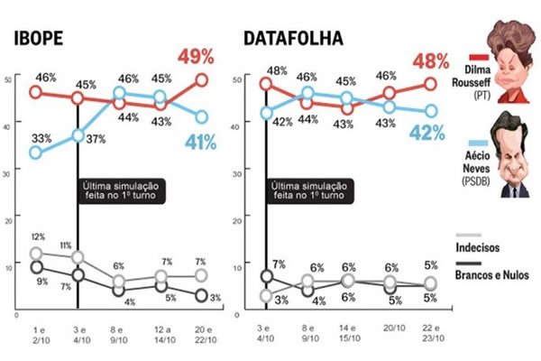 Com pesquisa feita de segunda-feira a quarta-feira, o Ibope aponta Dilma com 49% das intenções de voto, contra 41% de Aécio – diferença de oito pontos percentuais. Após ouvir eleitordes na quarta-feira e nesta quinta-feira, o Datafolha mostra uma distância menor: 48% contra 42%, ou seis pontos percentuais.