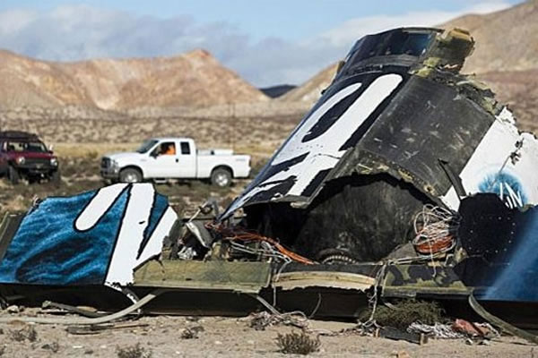 Os destroços da aeronave estão espalhados pelo deserto de Mojave, a nordeste de Los Angeles. A polícia isolou a área, pois há o temor de que partes da nave possam explodir.