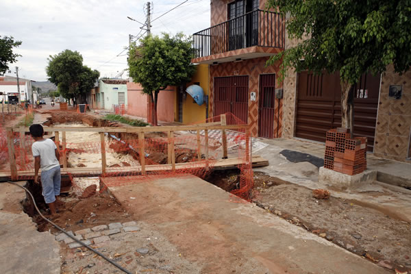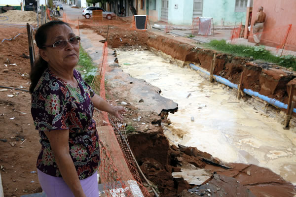 Com as chuvas dos últimos três dias o buraco que foi aberto para que seja ampliada a rede de escoamento da água cresceu consideravelmente já avançando por algumas calçadas como a da senhora Teresinha Bezerra que teme o desabamento de um muro de sua residência.