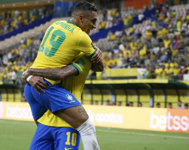 Depois de dois jogos apresentando dificuldades no setor de criação, a seleção brasileira jogou bem contra o Uruguai nesta quinta-feira, 14, e venceu por 4 a 1, na Arena da Amazônia, em Manaus. O destaque da partida foi Raphinha, estreando como titular com a amarelinha. O resultado mantém o Brasil em primeiro na tabela das eliminatórias sul-americanas com 31 pontos. Desde o início da partida, a seleção se mostrou mais a vontade para jogar. Aos 10 minutos, Neymar recebeu de Fred dentro da área e chutou na saída de Muslera para abrir o placar. Aos 17, o camisa 10 tentou outra jogada, a bola foi parcialmente defendida pelo goleiro uruguaio e, na sobra, Raphinha concluiu para as redes, ampliando o marcador.