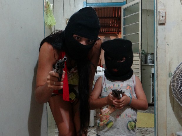 Adolescente e criança posam para fotos com capuz e armas nas mãos