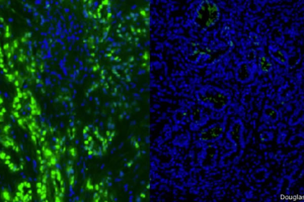 À esquerda, células de câncer no pâncreas aparecem em verde. Após o