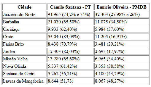 O candidato Eunício Oliveira obteve pouco mais de 700 mil votos na capital, enquanto nas principais cidades da Região do Cariri foram 231.232 votos para o petista enquanto o pemedebista faturou 82.270.